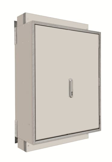 Brandschutz-Mantelgehäuse, Baureihe MF, Leerschrank, Montageart: Aufputz, für den Innenbereich, mit Tür, Schutzklasse II (schutzisoliert), Schutzart IP41, Baustoff nach A2 - nicht brennbar, geprüft nach DIN 4102-1, rauchdicht, Feuerwiderstand 30 min geprüft nach DIN 4102-2, Brandlastdämmung 30 min in Anlehnung an DIN 4102-11, Funktionserhalt 30 min in Anlehnung an DIN 4102-12, Bemessungsbetriebsspannung Ue 400V AC 50/60 Hz, oberflächenbeschichtet, in RAL ähnlich 7035, Gehäuse aus nicht brennbarem Material, einflüglige Tür, Tür aus nicht brennbarem Material, mit Schwenkhebel mit Halbzylinder, Türöffnungswinkel 180 Grad, Türanschlag rechts, Leitungseinführung oben über Kabelschott, unten über Kabelschott, Abmessungen in mm (H x B x T): 1048 x 989 x 312, Rasteinheit 5 RE, Bauhöhe 1, Feldbreite 2, Gehäuse für Montage über vorhandene Verteiler