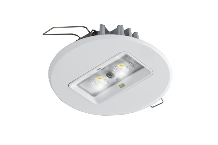 Sicherheitsleuchte als LED-Einbau-Downlight mit runder Abdeckung. Dezente, kleine Sicherheitsleuchte aus weißem Kunststoff (RAL 9003), mit optimierter Ausleuchtung großer quadratischer Flächen zur Erreichung besonders weiter Montageabstände bei Deckenhöhen von 2,5 bis 4,5 m,