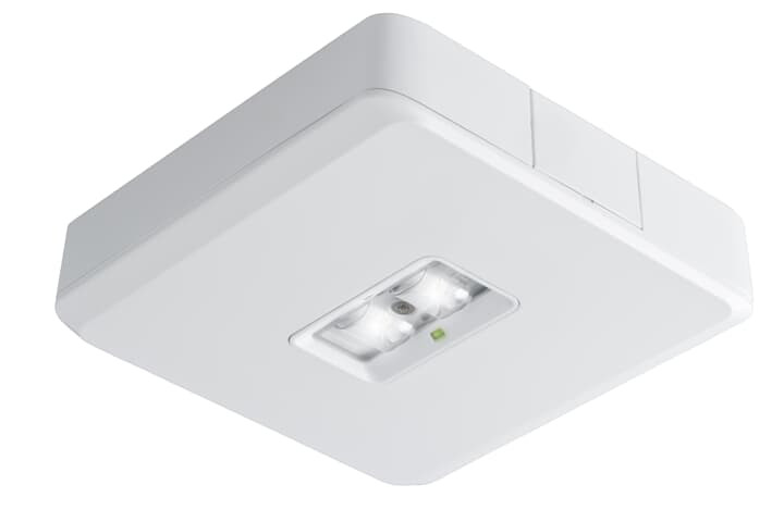 Dezente, kleine Sicherheitsleuchte in sehr flachem, weißen Gehäuse (RAL 9003), mit optimierter Ausleuchtung des Fluchtweges zur Erreichung besonders weiter Montageabstände bei Deckenhöhen von 4,0 bis 12,0 m.