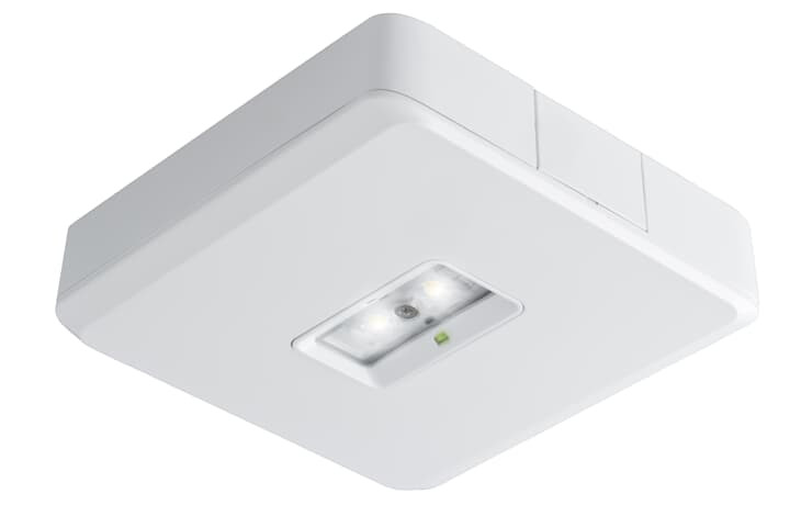 Dezente, kleine Sicherheitsleuchte in sehr flachem, weißen Gehäuse (RAL 9003), mit optimierter Ausleuchtung großer quadratischer Flächen zur Erreichung besonders weiter Montageabstände bei Deckenhöhen von 2,5 bis 4,5 m.
