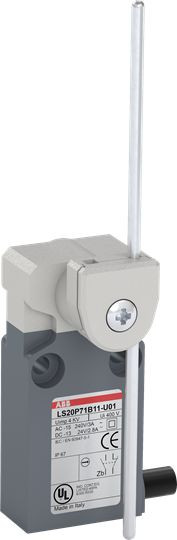 LS20P71B11-U01 ist ein 30 mm breiter, kompakter Positionsschalter aus glasfaserverstärktem UL-V0-Material, mit 2 Befestigungsbohrungen M4 oben, einem vorverdrahteten UL62 - PVC-Kabel (1 m) an der Seite, einem abgeflachten, verstellbarer Edelstahl-Stabhebel sowie 1 Schließer + 1 Öffner als Sprungkontakt