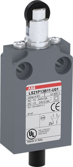 LS21P13B11-U01 ist ein 30 mm breiter, kompakter Positionsschalter aus glasfaserverstärktem UL-V0-Material, mit 2 Befestigungsbohrungen M4 oben, einem vorverdrahteten UL62 - PVC-Kabel (1 m) an der Seite, einem abgeflachten Kunststoff-Rollendruckbolzen sowie 1 Schließer + 1 Öffner als Sprungkontakt