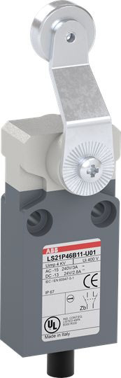 LS21P46B11-U01 ist ein 30 mm breiter, kompakter Positionsschalter aus glasfaserverstärktem UL-V0-Material, mit 2 Befestigungsbohrungen M4 oben, einem vorverdrahteten UL62 - PVC-Kabel (1 m) an der Seite, einem abgeflachten Metall-Rollenschwenkhebel sowie 1 Schließer + 1 Öffner als Sprungkontakt