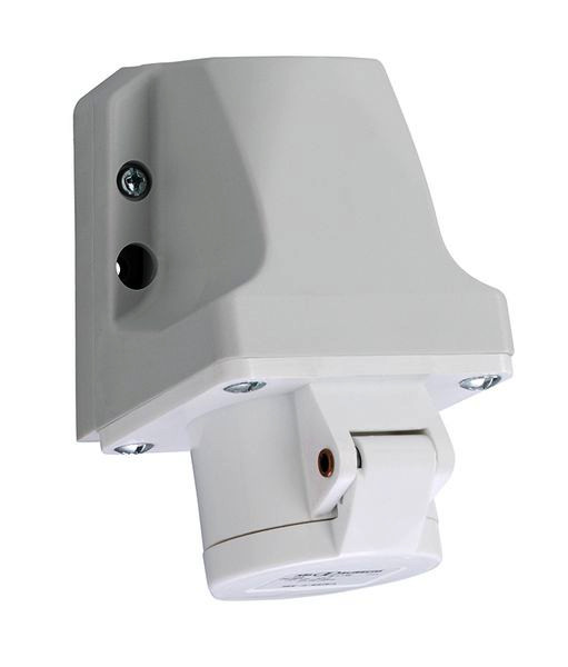 CEE Kleinspannungssteckvorrichtung als Wandsteckdose, VDE 0623, EN 60309, IEC 60309, Schutzart spritzwassergeschützt IP44, Nennstrom 16A, 2-polig, Nennspannung 42V AC, 12h, weiß, Leitungseinführung oben, unten oder hinten, 15° geneigt, mit vernickelten Kontakten