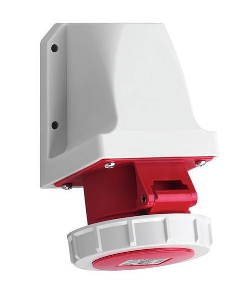 CEE Wandsteckdose, nach VDE 0623, EN 60309 Teil 1/2, IEC 60309, Schutzart wasserdicht IP67, Nennstrom 32A, 3-polig, Nennspannung 230V AC, 6h, blau, Schraubklemmen, Leitungseinführung oben oder hinten, inkl. Blindverschraubung, M25, Neigung 15°,mit vernickelten Kontakten