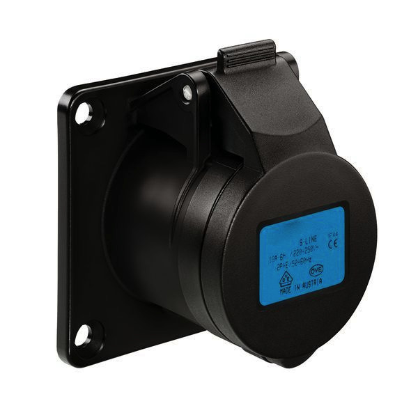 | Kurzbeschreibung | CEE Flanschsteckdose gerade, schwarz, IP44, 16A, 3-polig, 230V, 6h, blau |