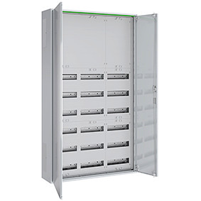 Komplettschrank für Aufputzmontage bestehend aus: RS-Gehäuse mit Volltür, Feldbreite 3, Bauhöhe 9, Verteilerbereich 6-reihig, 216 TE, für Reiheneinbaugeräte, Reihenklemmenbereich 3-reihig, geschlossene Abdeckung, isolierten Gerätetragschienen, für Reihenklemmen, IP44