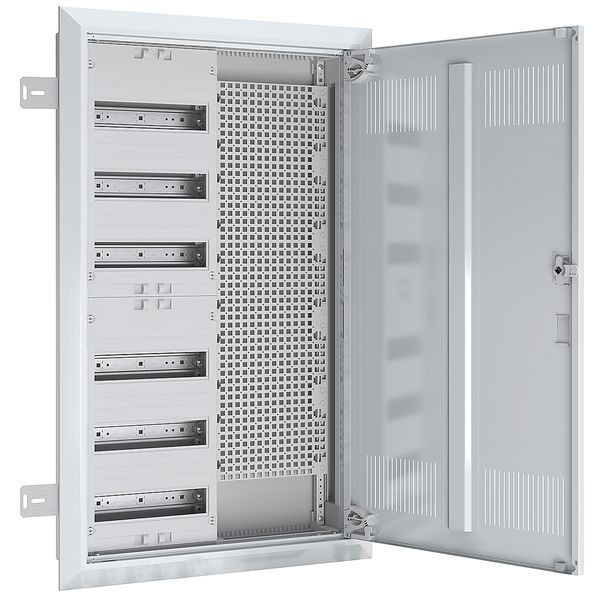 Komplettschrank für Unterputz- und Hohlwand- Montage bestehend aus: Blendrahmen inkl. Tür mit Lüftungsschlitzen, 1x Verteilerfeld 6-reihig, 1x Multimediafeld LexCom Home bestehend aus: 5x vollflächige Multimedia-Montagefläche zur Aufnahme von LexCom Zubehör in Steck- und Schraubtechnik