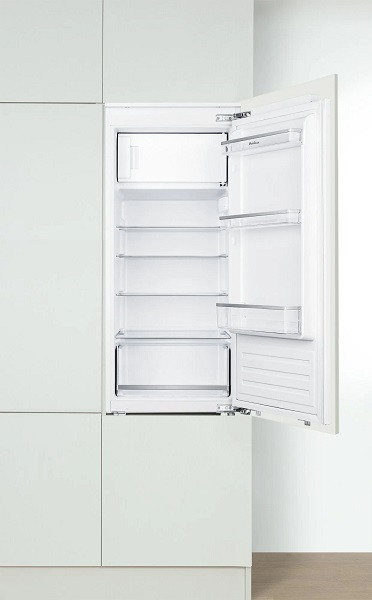 Einbau-Kühlschrank mit Festtür-Technik, elektronischer Steuerung, Tür-Offen-Alarm und Inverter Kompressor. Nutzinhalt: 179 l (163 l Kühlen, 16 l Gefrieren). Ausstattung: automatische Abtauung im Kühlbereich, 3 Glasablagen, Gemüseschublade, LED-Beleuchtung, integrierte Flaschenablage. Energieeffizienzklasse D, 118,3 kWh/Jahr. Nischenmaße: 1223 x 560 x 550 mm. Geräuschpegel: 35 dB(A). Klimaklasse SN-T (10-43°C). Gewicht: 35 kg netto.
