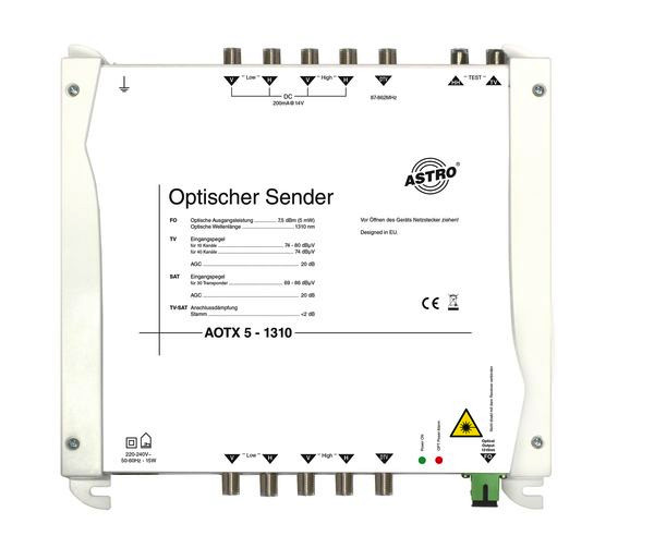 Optischer Sender, 5 mW Ausgangsleistung, Wellenlänge 1310 nm, elektrische Eingänge für Direktanschluss eines Standard-LNB, mit LNB-Versorgung 14 V 200 mA und terr. Eingang, optischer Ausgang 7 dBm mit SC/APC-Konnektor und AGC, integriertes Netzteil