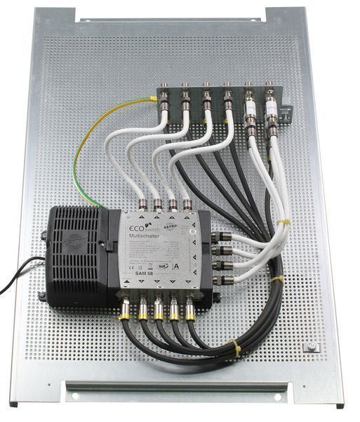 Installations-Kit bestehend aus SAM 58 ECO Multischalter 5 in 8 vormontiert auf Lochblechplatte LB 4060 inklusive Erdungsschiene und Überspannungsschutz, fertig verdrahtet für die Montage in Satellitenempfangsanlagen für eine Satellitenposition