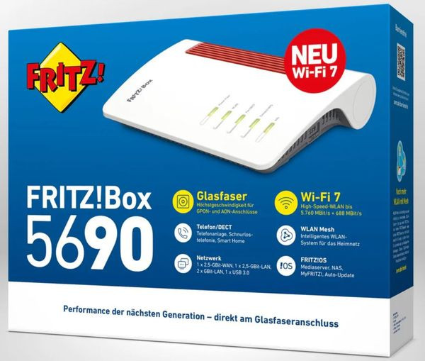 Glasfaser-Router für den Anschluss an AON (Active Optical Network) und GPON (Gigabit Passive Optical Network), unterstützt die Wellenlängen TX 1310 nm und RX 1490, maximale Geschwindigkeit und Flexibilität für Glasfaser, Wi-Fi 7 bis 6,4 GBit/s mit WLAN Mesh,intelligentes WLAN-Mesh erweitert das Heimnetz bis in jeden Raum, intelligente Automatisierung im Smart Home für DECT ULE-Geräte, komfortable Schnurlostelefonie und integrierte Telefonanlage, kompatibel zu den WLAN-Standards IEEE 802.11a/g/n/ac/ax/be