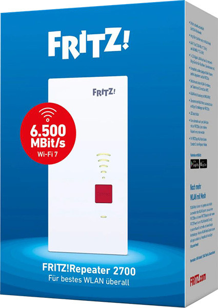 Anschlüsse: Wi-Fi 7 bis 6,5 GBit/s mit 2,4 und 5 GHz, 1x 1,25 Gigabit-LAN. Leistungsmerkmale: Leistungsstarker WLAN-Repeater für große Reichweite und hohen Datendurchsatz, WLAN bis 5.760 MBit/s (5 GHz) und 688 MBit/s (2,4 GHz), zwei Funkeinheiten zur optimalen Versorgung zahlreicher WLAN-Geräte, vergrößert das Heimnetz mit WLAN Mesh, kompatibel zu allen WLAN-Routern mit den WLAN-Standards IEEE 802.11a/g/n/ac/ax/be, perfekt abgestimmt auf die FRITZ!Box, lässt sich per Kabelverbindung an einen Router anschließen (LAN-Brücke), Verschlüsselung mit WPA3/2, einfaches Verbinden per Tastendruck (WPS), Anzeige für Verbindungsqualität und Status, intuitive Browser- und App-basierte Benutzeroberfläche.