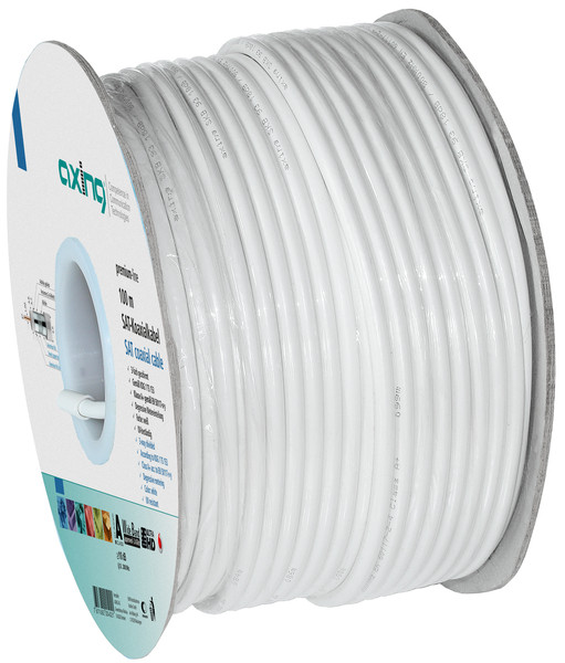 Flammwidriges, halogenfreies Koaxialkabel, 3-fach geschirmt, 100 m, Für SAT-/CATV-Hausinstallation, Vodafone gelistet, Gemäß KDG 1 TS 153, Klasse A+ gemäß EN 50117-9-2, Brandklasse Cca gemäß EN 50575, Innenleiter Cu, Durchmesser 1,02 mm, Physikalisch geschäumtes Dielektrikum, Durchmesser 4,6 mm, Schirmung Alufolie, geklebt/verzinntes Cu-Geflecht/Alufolie, Mantel LSZH, weiß, UV-beständig, Degressive Metereinteilung, 100 m auf Pappkartonspule
