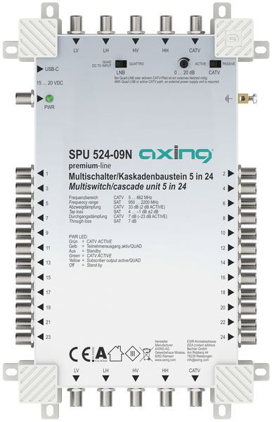Multischalter Stand-Alone/Kaskadenbaustein, 5 in 24, premium-line, Für bis zu 24 Teilnehmer, SAT aktiv und Quad-LNB-tauglich, CATV-Zweig aktiv schaltbar und einstellbar, Breitbandig rückkanaltauglich bei passivem CATV-Zweig (geeignet für EoC bis 204 MHz), Bei passivem CATV-Zweig und Quattro-LNB Receiver-gespeist ? kein Netzteil nötig, Bei aktivem CATV-Zweig oder Quad-LNB Stromversorgung über ext. Netzteil SZU 99-09N (nicht im Lieferumfang enthalten) oder über die SAT-ZF-Stammleitungen, Zeitgemäße Standby- und Energiesparfunktionalitäten, USB-C-Anschluss für externes Netzteil, Kaskadierbar (nicht verwendete Kaskadeausgänge müssen mit DC-entkoppelten 75 Ohm Abschlusswiderständen abgeschlossen werden (z. B. CFA 11-00, nicht im Lieferumfang enthalten))