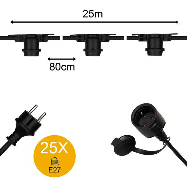 BAI Lichterkette 25m Schwarz mit 25 Fassungen E27 Max 25W pro Fassung IP44 CLII Kabel H07RN-F 2x1.5mm² mit Stecker Koppelbar. Fassungen und Lampen sollten nach unten zeigen