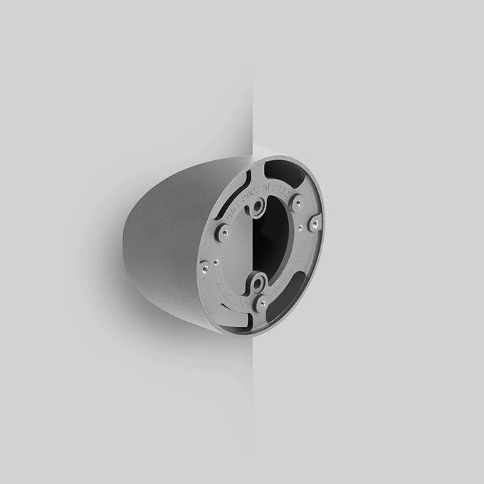 BEGA Eckbock 13604A für die Montage von Wandleuchten mit runder Montageplatte auf einer Haus- oder Gebäudeecke. Bestehend aus Aluminiumguss und Edelstahl, Farbe Silber, Ø 130 mm.