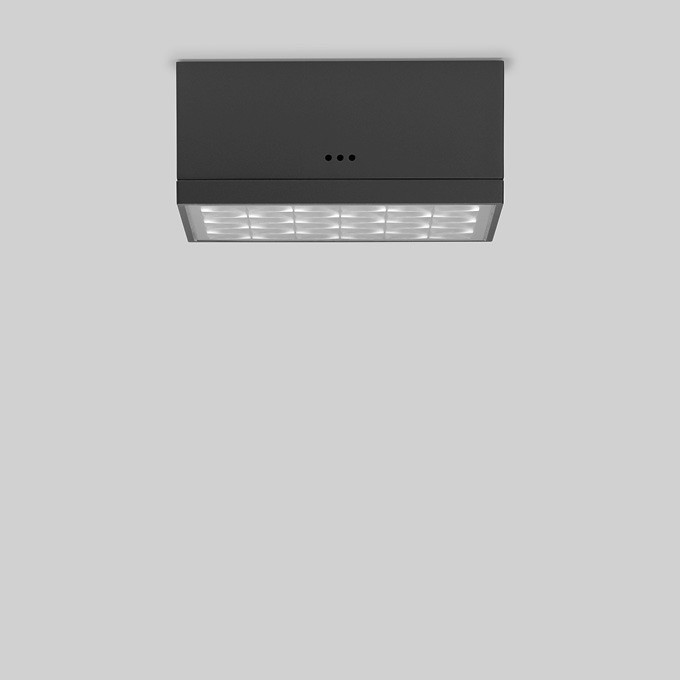 BEGA Deckenaufbau-Tiefstrahler 24468K4. Symmetrisch breitstreuende Lichtstärkeverteilung. BEGA Vortex Optics® : Effizientes optisches System, das nahezu keinem Verschleiß unterliegt. LED, 69 W Leuchten-Anschlussleistung, Leuchten-Lichtstrom 7825 lm, Halbstreuwinkel 90°, Farbtemperatur 4000 K. Farbwiedergabeindex (CRI) > 80. Mit austauschbarem BEGA LED-Modul mit Übertemperaturschutz und einer Lebenserwartung von mindestens 50.000 Betriebsstunden. 20-jährige Nachliefergarantie auf das LED-Modul und die Verschleißteile. Mit LED-Netzteil, DALI-steuerbar, 220-240 V, 0/50-60 Hz. Schutzart IP 65. Ballwurfsicher. Leuchte aus Aluminiumguss, Aluminium und Edelstahl Beschichtungstechnologie BEGA Unidure® , Farbe Grafit. Sicherheitsglas mit optischer Struktur. Reflektoroberfläche aus eloxiertem Reinstaluminium. Anschlussdose mit 2 Leitungsverschraubungen zur Durchverdrahtung der Netzanschlussleitung von ø 5-13 mm, max. 5 x 2,5 qmm. Abmessungen: 250 x 250 x 110 mm.
