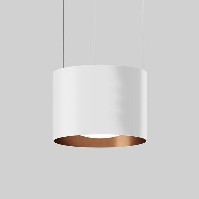 BEGA STUDIO LINE Pendelleuchte 50781.6K3 für den Innenbereich. Zweiseitiger, abgeblendeter Lichtaustritt. LED, 26,7 W Leuchten-Anschlussleistung, Leuchten-Lichtstrom 1831 lm, Farbtemperatur 3000 K. Farbwiedergabeindex (CRI) > 90. Mit austauschbarem BEGA LED-Modul mit Übertemperaturschutz und einer Lebenserwartung von mindestens 50.000 Betriebsstunden. 20-jährige Nachliefergarantie auf das LED-Modul und die Verschleißteile. Mit LED-Netzteil, DALI-steuerbar, 220-240 V, 0/50-60 Hz. Leuchtengehäuse aus Aluminium. Oberfläche Farbe samtweiß. Innenfarbton kupfer matt. Schlagfeste Kunststoffabdeckung, weiß. 3 Stahlseilaufhängungen · Anschlussleitung weiß 5 x 0,75 qmm. Abmessungen Ø 300 x 200 x 1950 mm