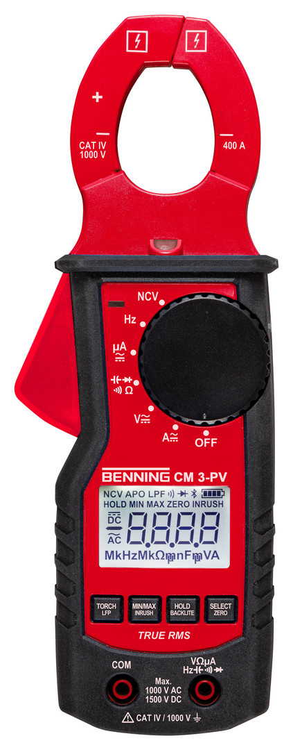 Benning CM 3-PV. True RMS Stromzangen-Multimeter für PV-Anlagen und Anwendungen mit 1000 V AC/ 1500 V DC Systemspannung. Geeignet für Photovoltaik, Elektrotechnik, Industrie, Service, Handwerk, KFZ. 4-stellig beleuchtete LCD-Anzeige (4.000 Punkte). AC/DC Strom (0,1 ?A - 400 ?A (Buchse), 10 mA - 400 A (Zange)), Spannung (1 mV - 1000 V AC/1500 V DC), Widerstand (0,1 ? - 40 M?), Frequenz (1 Hz - 5 MHz), Kapazität (0,1 nF - 100 µF), Durchgangs- (Summer/ LED) und Diodenprüfung. Präzise durch Echt-Effektivwertmessverfahren TRUE RMS. Einschaltstrommessung (INRUSH) von Motoren und Beleuchtungsanlagen. Tiefpassfilter (LPF, 1 kHz) für Messungen an getakteten Motorantrieben. Voltsensor zur berührungslosen Phasen- und Kabelbruchprüfung (LED/ LCD). Funkschnittstelle (Cordless-Link) zur Betriebsstrommessung des PV-Strangs für PV-Installationstester Benning PV 125 (Art.-Nr. 10241491, optional) und PV-Installationstester und Kennlinienmessgerät Benning PV 225 (Art.-Nr. 10241492, optional). Messwert- (HOLD) und Maximal-/ Minimalwertspeicher (MAX/MIN), Nullabgleich (ZERO). Automatische Messbereichswahl, Abschaltung, Batterieunterspannungsanzeige. LED-Messstellenbeleuchtung und gummierter Griffbereich. Zangenöffnung max. 30 mm. Messkategorie CAT IV 1000 V. Inkl. Tasche, Messleitungen, 2 x 1,5 V Micro/ AAA/ LR03 Batterien.