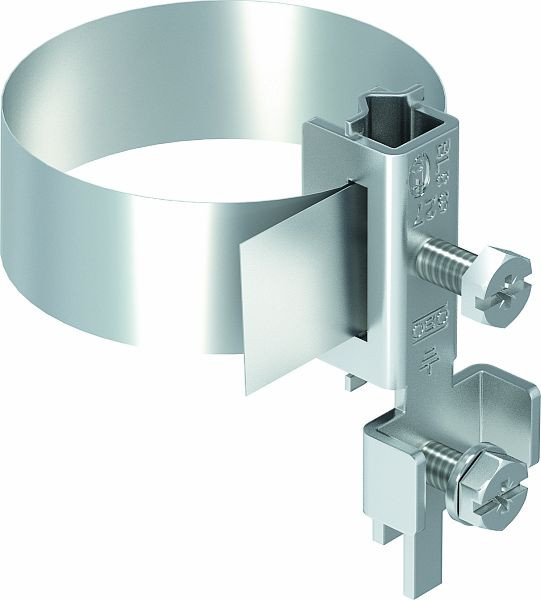 Banderdungsschelle zur Vermeidung von Gleitentladungen an der isCon-Leitung. Montagelänge für bis zu zwei isCon-Leitungen geeignet. Montage am isolierten Fangmasten Typ isFang.