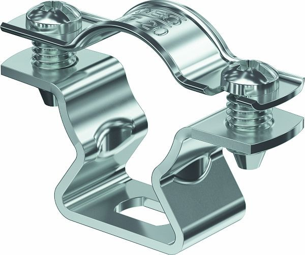 Abstandschelle zur Montage von Rohren und Kabeln an Wand, Decke und Boden. Mit selbstsicherndem Oberteil. Befestigung über Langloch.