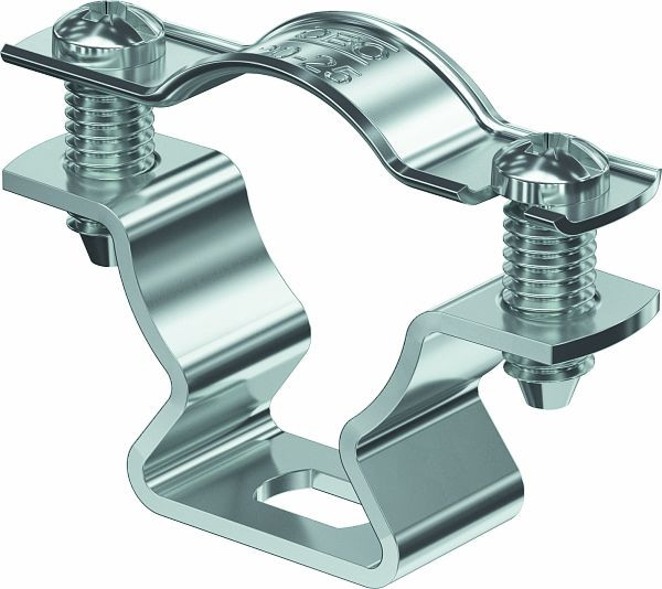 Abstandschelle zur Montage von Rohren und Kabeln an Wand, Decke und Boden. Mit selbstsicherndem Oberteil. Befestigung über Langloch.