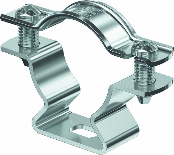 Abstandschelle zur Montage von Rohren und Kabeln an Wand, Decke und Boden. Mit selbstsicherndem Oberteil. Befestigung über Langloch.