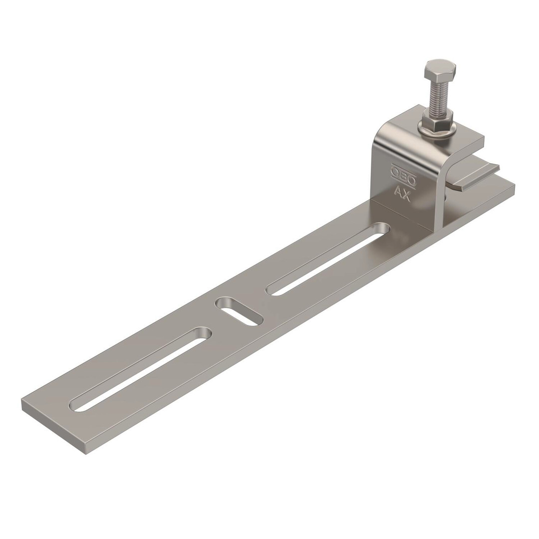 Befestigungsklemmstück zur Montage von leichten Bauteilen an waagerechten Stahlträgern. Geeignet z. B. für Gitterrinnen und Kabelrinnen bis 300 mm Breite oder Schellen. Der Verlauf des am Befestigungsklemmstück angebrachten Kabeltragsystems ist waagerecht.