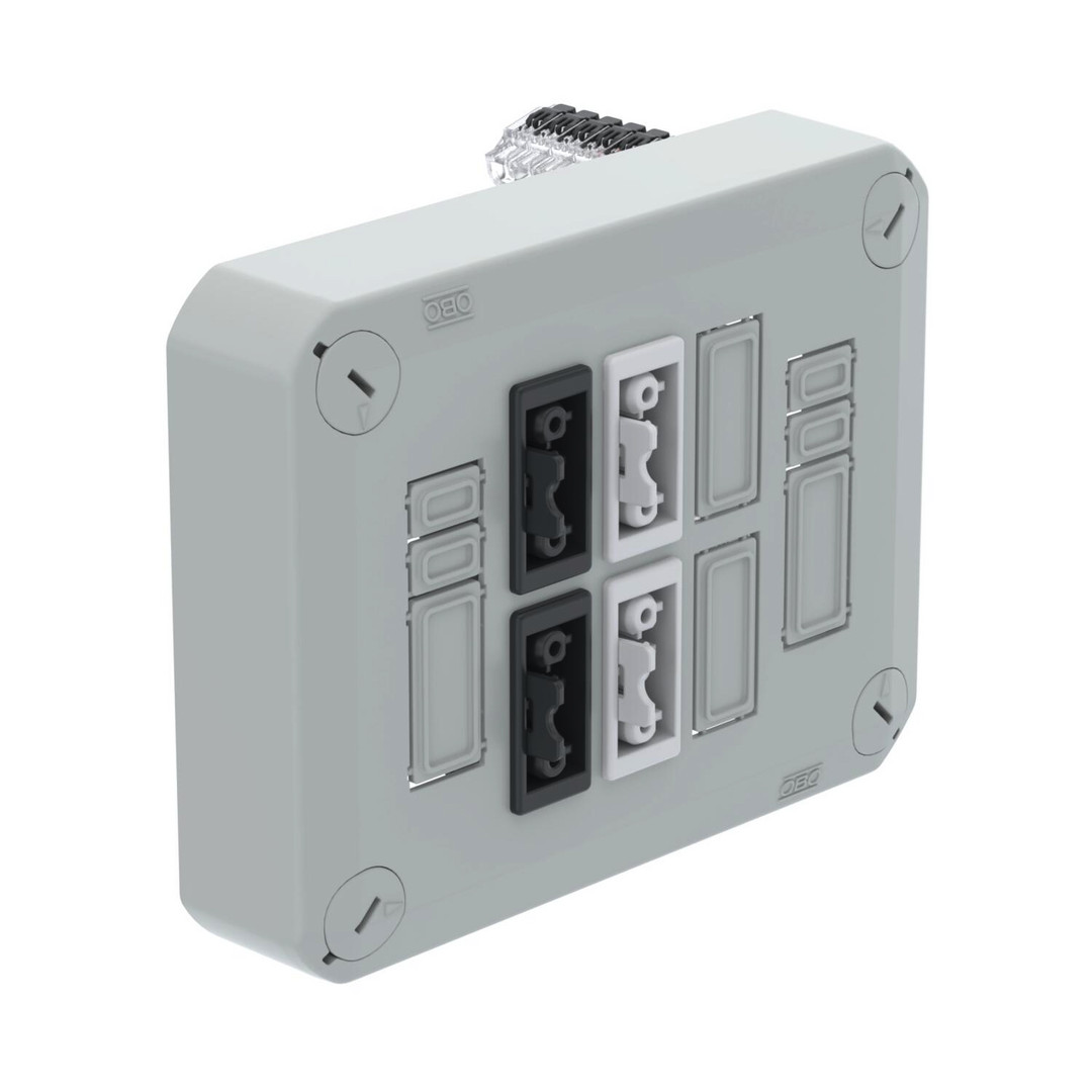 Steckbarer Deckel zum Verschließen von Kabelabzweigkästen, bestückt mit 4 Wieland GST18-Stecksystemen, vorverdrahtet mit Hebelsteckklemmen. Mit Schnellverschluss im Deckel, plombierbar. Halogenfreies Material, UV-resistent. Flammwidrig nach DIN EN 60695-2-11, Prüftemperatur 650°C. Schlagfestigkeit IK07 bei Raumtemperatur. Schutzart IP30.