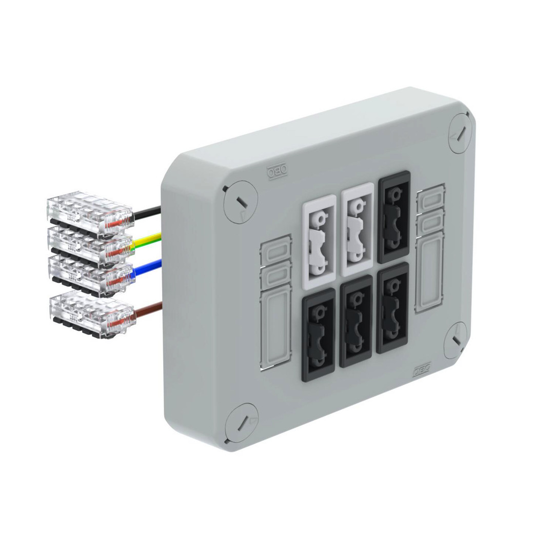 Steckbarer Deckel zum Verschließen von Kabelabzweigkästen, bestückt mit 6 Wieland GST18-Stecksystemen, vorverdrahtet mit Hebelsteckklemmen. Mit Schnellverschluss im Deckel, plombierbar. Halogenfreies Material, UV-resistent. Flammwidrig nach DIN EN 60695-2-11, Prüftemperatur 650°C. Schlagfestigkeit IK07 bei Raumtemperatur. Schutzart IP30.