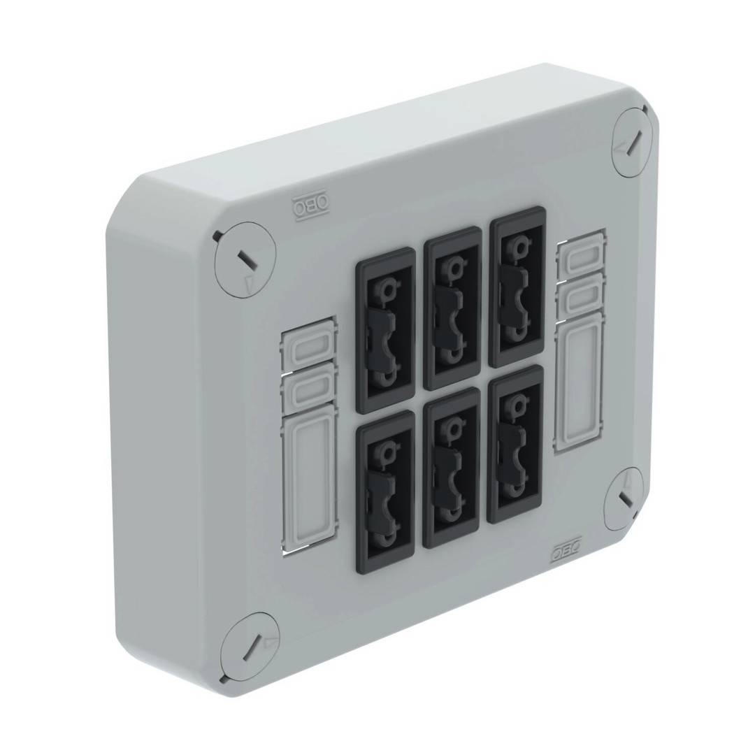 Steckbarer Deckel zum Verschließen von Kabelabzweigkästen, bestückt mit 6 Wieland GST18-Stecksystemen, vorverdrahtet mit Hebelsteckklemmen. Mit Schnellverschluss im Deckel, plombierbar. Halogenfreies Material, UV-resistent. Flammwidrig nach DIN EN 60695-2-11, Prüftemperatur 650°C. Schlagfestigkeit IK07 bei Raumtemperatur. Schutzart IP30.