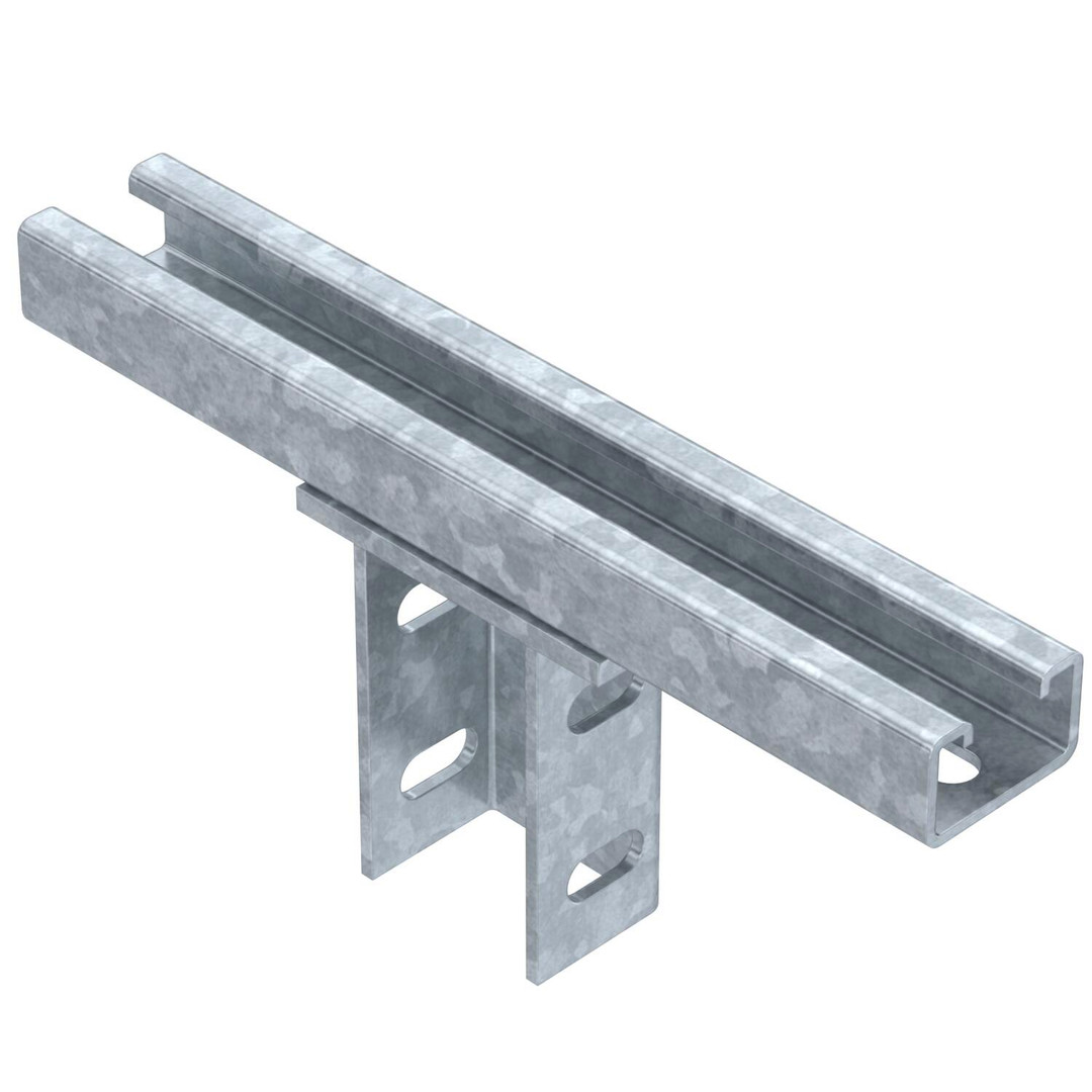 Kopfplatte in schwerer Ausführung mit angeschweißter MS5030-Profilschiene, zum Erstellen von Hängestielen in Verbindung mit US 7-Stielen. Montage an Stahlkonstruktionen mit Spannklauen. Kabeltrassenverlauf quer zu der Profilschiene. Inklusive Befestigungsmaterial für US 7-Stiel.