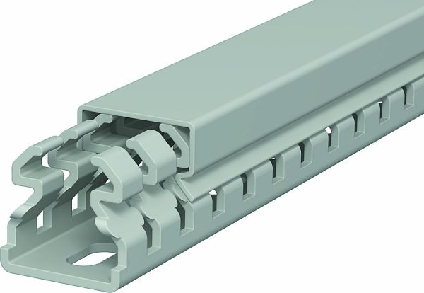 Verdrahtungskanal nach DIN EN 50085-2-3 inkl. Oberteil und Bodenlochung zur waagerechten und senkrechten Verlegung elektrischer Kabel und Leitungen im Schaltschrank. Ausführung als DIN-Kanal. Das Ausbrechen der Stege erfolgt werkzeuglos. Bodenbündiges Ausführen ist durch Sollbruchstellen möglich. Geprüft nach DIN EN 50085-2-3. Sonderlängen auf Anfrage.
