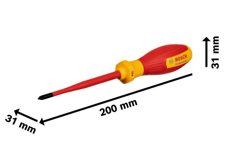 Professionelle Handwerker brauchen Werkzeuge, die leicht anzuwenden sind und allen gesetzlichen Vorgaben entsprechen. Mit dem Bosch Professional VDE-Schraubendreher PZ1 x 100 lassen sich Schrauben auch bei unerwartetem Kontakt mit stromführenden Teilen anziehen und lösen. Dieses normgerechte Werkzeug ist mit thermoplastischem Elastomer (TPE) isoliert. Es wurde bis zu 10.000 Volt geprüft und bis 1.000 Volt VDE-zertifiziert gemäß DIN EN/IEC 60900. Unser VDE-Schraubendreher ist präzise und langlebig. sein schlanker Schaft und die robuste Spitze gewährleisten Passgenauigkeit. Sein Softgrip und sein hoch ergonomisches Design sind handfreundlich und bequem bei der Arbeit. Die S2-Schraubendreherklinge verfügt über eine isolierende Schutzbeschichtung und der Handgriff ist mit TPE isoliert. Durch die Aufnahme von VDE-Handwerkzeugen in unser Bosch Professional-Sortiment sind nun alle erforderlichen Werkzeuge in zuverlässiger Bosch-Qualität erhältlich.