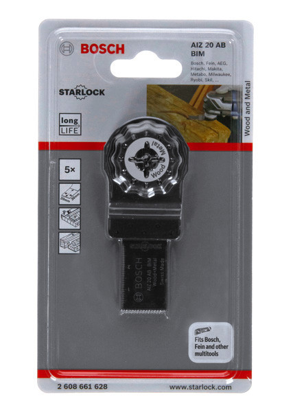 Das Tauchsägeblatt Starlock AIZ 20 AB ermöglicht Feinschnitte in Holz und ungehärtetes Metall. Das schmale Blatt von 20 mm Breite ermöglicht Filigranarbeit. Das robuste Starlock-Aufnahmesystem reduziert Lateralschwingung des Blattes und ermöglicht mittels direkter Kraftübertragung haarfeine Schnitte. Es wird verwendet für das Sägen von Aussparungen in Möbelbauteile, bündiges Ablängen von Kupferrohren und Tauchschnitte in Gipskartonplatten. Dieses Blatt sägt Holz und ungehärtetes Metall, weiche Kunststoffe und Paneele mit Kunststofflaminierung. Die Bimetallverbindung aus Blatt aus HCS-Stahl (Stahl mit hohem Kohlenstoffgehalt) und Zähnen aus HSS-Stahl (Schnellarbeitsstahl) ist verschleiß- und hitzeresistent und gewährt dem Blatt beim das Schneiden von ungehärtetem Metall und abrasivem Material eine hohe Lebensdauer. Das Starlock-Aufnahmesystem ermöglicht ?einen schnellen Blattwechsel ohne Blattberührung in drei Sekunden.? Das Aufnahmesystem ermöglicht durch seine dreidimensionale enge Passung maximale Kraftübertragung zwischen Maschine und Zubehör.