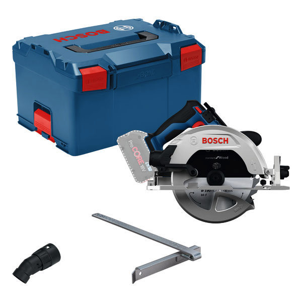 Akku-Kreissäge GKS 18V-68-2, Wenn du eine leistungsstarke Akku-Kreissäge benötigst, die selbst zähe Materialien schnell und präzise schneidet, ist die Bosch GKS 18V-68-2 genau das Richtige für dich. Die robuste Säge bewältigt Weich- oder Hartholz ohne Blockieren sowie anspruchsvolle Arbeitslasten dank ihrer erhöhten Überlastfähigkeit. Die GKS 18V-68-2 liefert nötige Power, um deine Leistung zu steigern, ohne ein Kabel zu benötigen. Dank ihres starken bürstenlosen Motors bietet sie eine überragende Schnittgeschwindigkeit und bietet Schutz durch KickBack Control. Die PRO GKS 18V-68-2 ist für Kapp-, Längs- und Schrägschnitte in unterschiedlichen Holzarten von Kiefer bis Nussbaum sowie mehrschichtigen OSB-Platten geeignet. Die PRO GKS18V-68-2 verfügt über einen Paddelschalter und liefert eine Leistung, die mit der einer kabelgebundenen 1400-W-Säge vergleichbar ist. Sie ist mit einem intelligenten Bremssystem ausgestattet und wiegt nur 3,5 kg (ohne Akku und Sägeblatt). Sie verfügt außerdem über einen Absaugadapter. Parallelanschlag (1 619 P16 999). Sägeblatt Holz