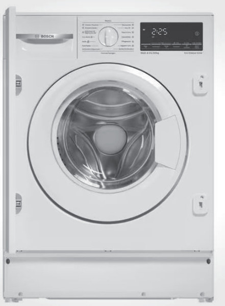 Leistung und Verbrauch Energieeffizienzklasse Waschen und Trocknen¹: E Energieeffizienzklasse Waschen²: A Stromverbrauch³ / Wasserverbrauch4 Waschen und Trocknen: 324 kWh / 80 Liter Stromverbrauch5 / Wasserverbrauch6 Waschen: 47 kWh / 48 Liter Beladung Waschen und Trocknen / Waschen: 1 - 5 kg / 1 - 8 kg Programmlaufzeit7 Waschen und Trocknen / Waschen: 9:20 h:min / 3:38 h:min Schleudereffizienzklasse: B Schleuderdrehzahl**: 600 - 1400 U/Min. Geräuschwert: 68 dB (A) re 1 pW Geräuscheffizienzklasse: A Programme Standardprogramme Waschen: Baumwolle, Pflegeleicht, Fein/Seide, Wolle/Handwäsche Spezialprogramme Waschen: Trommel reinigen (mit Erinnerungsfunktion), ExtraKurz 15', Hygiene Care, Mix, Schleudern/Abpumpen, Iron Assist (Refresh), Spülen / Schleudern Alle gängigen Waschprogramme können wahlweise auch als reines Trockenprogramm oder als kombiniertes Wasch- und Trockenprogramm genutzt werden Standardprogramme Trocknen: Baumwolle, Pflegeleicht Iron Assist: Entknittert saubere, trockene Kleidung mit Dampf in 20 Minuten.* Trocknungszeit wählbar für intensive und schnonende Trocknungsprogramme Spezialprogramme Trocknen: Intensiv trocknen, Schontrocknen, Waschen & Trocknen 60' Optionen SpeedPerfect: perfekt sauber in bis zu 65% weniger Zeit. *** Optionen Waschen: Drehzahlwahl, Extra Spülen, Lieblingsprogramme, SpeedPerfect, Start / Nachlegen, Temperaturwahl, Vorwäsche Optionen Trocknen: Bügeltrocken, Schranktrocken Trocknen-Option für die meisten Waschprogramme AutoDry-Funktion, Zeitprogramme Komfort und Sicherheit Nachlegefunktion: Die Nachlegefunktion ermöglicht Ihnen das Nachlegen von Wäschestücken sogar nach Start des Waschprogramms. Großes Display für Programmablauf, Temperatur, Drehzahl, Restzeit und 24 h Endezeitvorwahl, Anzeige der Trockenziele ActiveWater Plus: für effizienteste Wassernutzung auch bei kleinen Waschladungen dank automatischer Beladungskennung. Möbeltüranschlag wechselbar Vollelektronische Einknopf-Bedienung für alle Wasch- und Spezialprogramme Trommelreinigung mit Erinnerungsfunktion Trommelinnenbeleuchtung: LED EcoSilence Drive: leiser Motor mit langer Lebensdauer Tür mit Glasabdeckung Metallverschlusshaken Magnetverschluss für sofortiges Türöffnen am Programmende AquaStop®: eine Bosch Garantie bei Wasserschäden - ein Geräteleben lang* Technische Informationen Einbau-Waschtrockner, vollintegriert verstellbare Sockelhöhe: 16 cm verstellbare Sockeltiefe: 8 cm Gerätemaße (H x B): 82.5 cm x 59.5 cm Gerätetiefe: 52.5 cm Gerätetiefe inkl. Tür: 54.0 cm Gerätetiefe mit geöffneter Tür: 97.5 cm