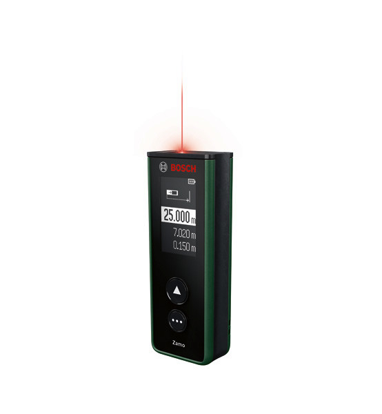 Digitaler Laser-Entfernungsmesser Zamo. Macht Messen einfach einfach. Leichte und genaue Entfernungsmessung bis zu 25 Meter und Flächenberechnung. Mehr Messfunktionalität mit Linien-, Rad- und Band-Aufsatz (separat erhältlich). Speichert die letzten 10 Mess- und Rechenwerte. Akkuladung und Software-Updates über USB-C®-Schnittstelle. Der Zamo ist nachhaltig konstruiert, weitere Informationen siehe unten. 2 x 1,2 V HR03 (AAA), Akkus. Quick Start Manual