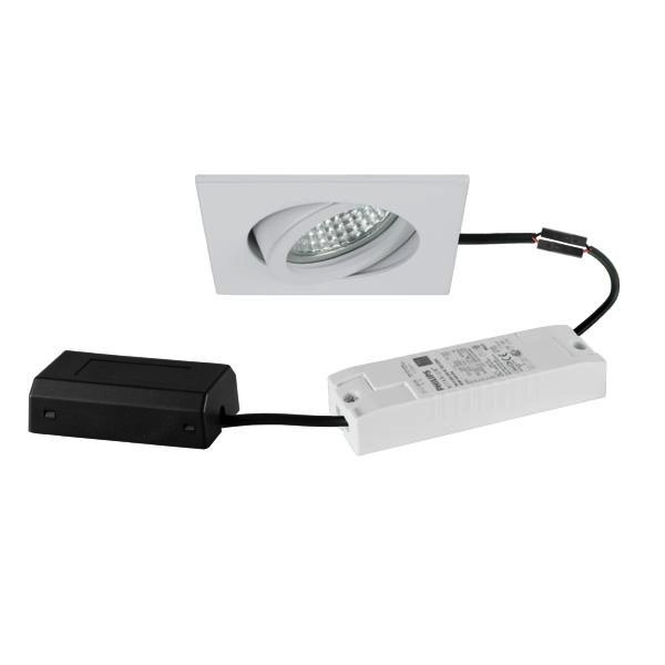 LED-Einbaustrahlerset, DALI dimmbar, mit Anschlussbox, weiß struktur, quadratisch. Ausgeführt in kompakter Bauform für werkzeuglose Schnellmontage zum Deckeneinbau. Set inkl. Konverter für 230 V-Netzspannung, DALI-2 dimmbar, ohne Nachglimm-Effekt, Maße Konverter: L 130 x B 42 x H 22 mm Montageart: Einbaumontage, Montageort: Deckenmontage, Material: Aluminium / Glas / Kunststoff, Schutzart raumseitig: nach DIN EN 60529: IP20, Schutzklasse: (EN 61140) II, Spannung: 230V AC 50Hz, Leistung: 6 W, Lichtstrom: 730 lm, Farbtemperatur: 3.000 K, Abstrahlwinkel: 38°, Verstellbarkeit: schwenkbar, Mit Betriebsgerät: Ja, Dimmbar: Ja, Art der Dimmung: DALI-2.