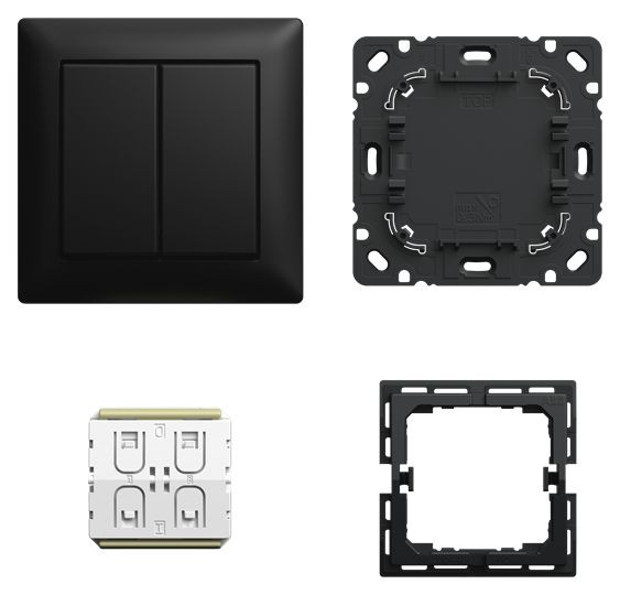 Bestehend aus 3 x Friends of Hue Smart-Switch-Einsatz 6716/01 U-500 bzw. 6716 U-500, 3 x 2-fach Wippe 6736 FoH-xxx für Smart-Switches, 3 x Abdeckrahmen 1-fach, 3 x Befestigungsplatte und 3 x Zwischenring.