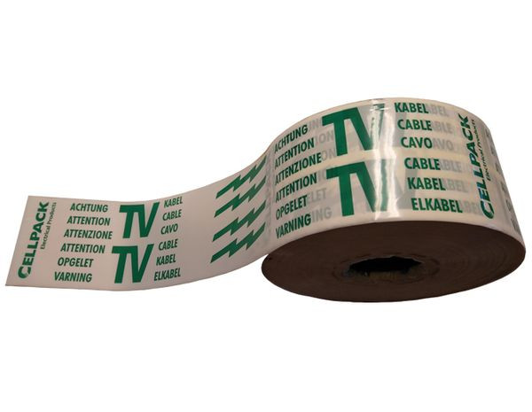 Warnband mit mehrsprachigem Aufdruck: Achtung TV Kabel, Attention TV Cable, Attenzione TV Cavo, Attention TV Cable, Attention TV Cable, Opgelet TV Kabel, Varning TV Elkabel