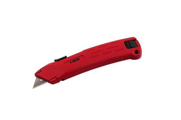 Automatikmesser rot, incl. Trapezklinge. Mit automatischem Klingen-Rückzug. Klingenwechsel werkzeuglos. Integriertes Klingendepot.