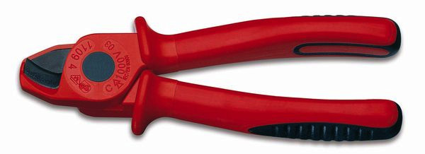 1.000 V Kabelschneider aus schlagfestem, glasfaserverstärktem Kunststoff mit Zwei-Komponentengriff, Schneideinsätze aus Spezialstahl, für flexible Al- und Cu-Leiter bis 15 mm ø, sehr gute Schneidleistung, robuste Ausführung, einsetzbar bei Temperaturen bis -40°C. Maße: 170 mm