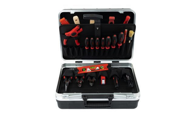 Lehrlingskoffer ECO, der robuste Werkzeugkoffer aus stoßfestem Kunststoff und mit stabilem Aluminiumrahmen. Zwei robuste, abschließbare Kippschlösser. Der Koffer istausgestattet mit einer herausnehmbarer Bodenabdeckplatte, die einseitig mit Werkzeugtaschen bestückt ist. Zudem eine herausnehmbare Werkzeugtafel mit Dokumentenfach und einer Vielzahl von Werkzeugeinsteckfächern, sowie eine tiefgezogene Bodenschale mit zahlreichen Unterteilungsmöglichkeiten. Größe: LxBxH: 395x455x205 mm. Gewicht: leer 3.450 g, bestückt 5.700 g. Inklusive 23 Qualitätswerkzeuge. Werkzeugkoffer-Bestückung: 1.000 V Telefonzange mit geraden Backen, 200 mm (10 0216), 1.000 V Seitenschneider, 160 mm (10 0574), 1.000 V Schlitz-Schraubendreher, in den Größen: 3,0x0,5x, 100 mm (11 7702), 4,0x0,8x, 100 mm (11 7704), 5,5x1,0x125 mm (11 7705), 1.000 V Kreuzschlitz-Schraubendreher, in den Größen: Phillips PH, 1x80 mm (11 7731), Phillips PH, 2x100 mm (11 7732), 1.000 V Kreuzschlitz-Schraubendreher in den Größen: Pozidriv PZ, 1x80 mm (11 7741), Pozidriv PZ, 2x100 mm (11 7742), Abisolierwerkzeuge: Kabelmesser ohne Klinge für Kabel mit einem Ø von 8 bis 28 mm (12 1014),Abisolierzange SUPER 4 Plus mit einem Ø von 0,2 bis 6 mm²(10 0780), Innendosen-Stabentmanteler mit einem Ø von 8 bis 13 mm (12 2027), Kabelschere DUOCUT (12 0108), Spannungsprüfer, 2-polig (11 1442), 1.000 V Sicherheits-Kabelmesser (12 1042), Taschensäge PUK, Spannweite 150 mm (12 0502), Schlosserhammer, nach DIN 1041/1193, 300 g(13 0804), Malerspachtel, Breite 40 mm (13 1324), Gipsmulde aus Weichgummi, ø 125 mm (14 0306), Wasserpinsel (14 0310),Holz-Gliedermaßstab, 2 m (21 0004), Schaltschrank-Wasserwaage 230 mm, Torpedoform, Horizontal-, Vertikal- und 45°-Libelle (21 1540), Zimmermannsstift, schwarz, 240 mm (21 2170)