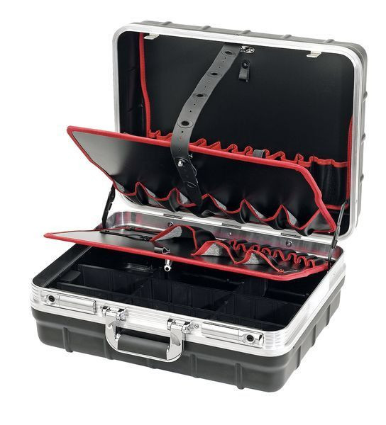 Werkzeugkoffer Champion, der Profi-Hartschalenkoffer mit breitem Aluminiumrahmen, sorgt für hohe Stabilität. Die Kofferschalen sind aus extrem schlag- und sturzfestem Polypropylen. Die besonders geräumige Bodenschale mit verschiedenen Stegen, dient zur sinnvollen Aufteilung in Kleingefache. Die 3 Werkzeugtafeln, mit 33 Taschen und 11 elastischen Stripes, in unterschiedlichen Größen, bieten viel Stauraum zur sicheren Aufbewahrung von Handwerkzeugen aller Art. Zusätzlich halten 3 Metallscharniere mit Rastmechanismus den Koffer ohne zusätzliche Streben sicher geöffnet. Komfort-Tragegriff mit Weichgummieinlage, 2 robuste abschließbare Schnappschlösser sowie ein Namensschild. Die Kofferschale und die Stadfüße sind in einem gespritzt, die gerippete Schalenstruktur dient zur besseren Auflage. Koffer leer: 5.200 g. Außenmaß: B/T/H: 478x410x219 mm; Innenmaß B/T/H1/H2/H#: 465/352/70/145/215 mm.