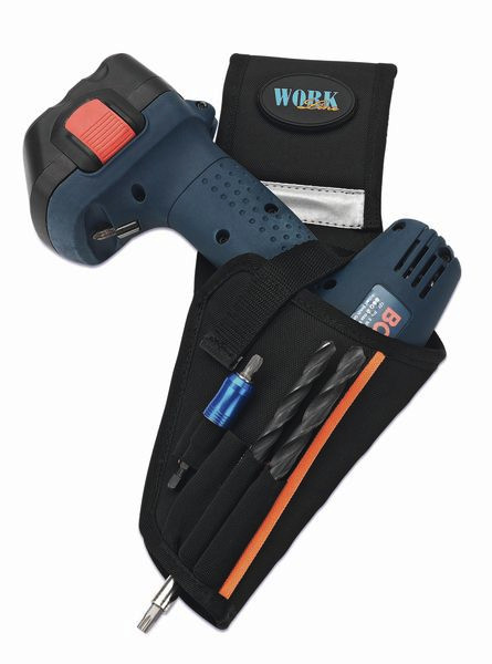 Akkuschrauber-Tasche-Gürtelholster zum Einstecken aller gängigen Akku-Handschraubmaschinen. Transportsicherung durch Fixierband mit Klettverschluss, 4 Einsteckfächer für Zubehör wie Bohrer, Bits, Bleistift usw., besonders robuste Ausführung durch Polsterung, verstärkten Stoff und Nieten, Gürtelschlaufe. Gewicht nur 120 g; Maße: 180x340 mm