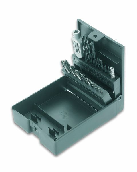 HSS-Gewindebohrer DIREKTSCHNEIDERE-Einschnittgewindebohrer DIN 352/B mit Schälanschnitt, für metrisches Regelgewinde, in Kunststoffkassette je 1 Stück Gewindebohrer M 3 - 4 - 5 - 6 - 8 - 10 - 12 je 1 Stück HSS-Spiralbohrer (Kernlochbohrer) 2, 5 - 3, 3 - 4, 2 - 5, 0 - 6, 8 - 8, 5 - 10,2 mm;1 Stück Windeisen Gr. 1 1/2 (für Gewindebohrer M 1 - M 12). VE:1