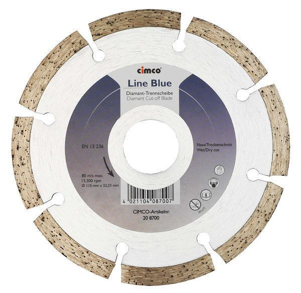Diamant-Trennscheiben Line Blue, mit aufgesinterten Diamantsegmenten, Stammblatthärte: 28HRC; geeignet für: Betonerzeugnisse (weich), Pflaster, Verbundstein, Mauerstein. Ausführung: Höhe: 7 mm; Segment Länge: 38 mm; Anzahl: 8; Ø-115 mm; VE: 1