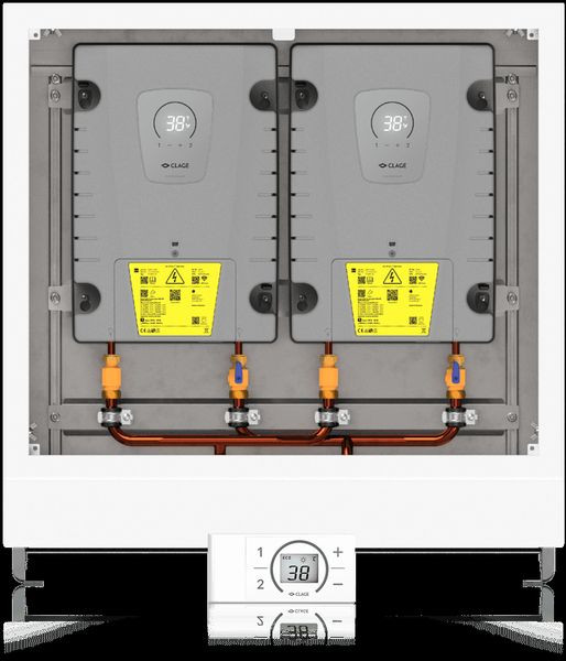Zwei E-Moduldurchlauferhitzer zur Versorgung einer oder mehrerer Entnahmestellen mit hohem Warmwasserbedarf (Mindestdurchsatz pro Einzelzapfstelle: 4 l/min), z. B. eine Wellness-Dusche. ‹ber die spezielle Twin-Software werden die Ger‰te synchron geschalte
